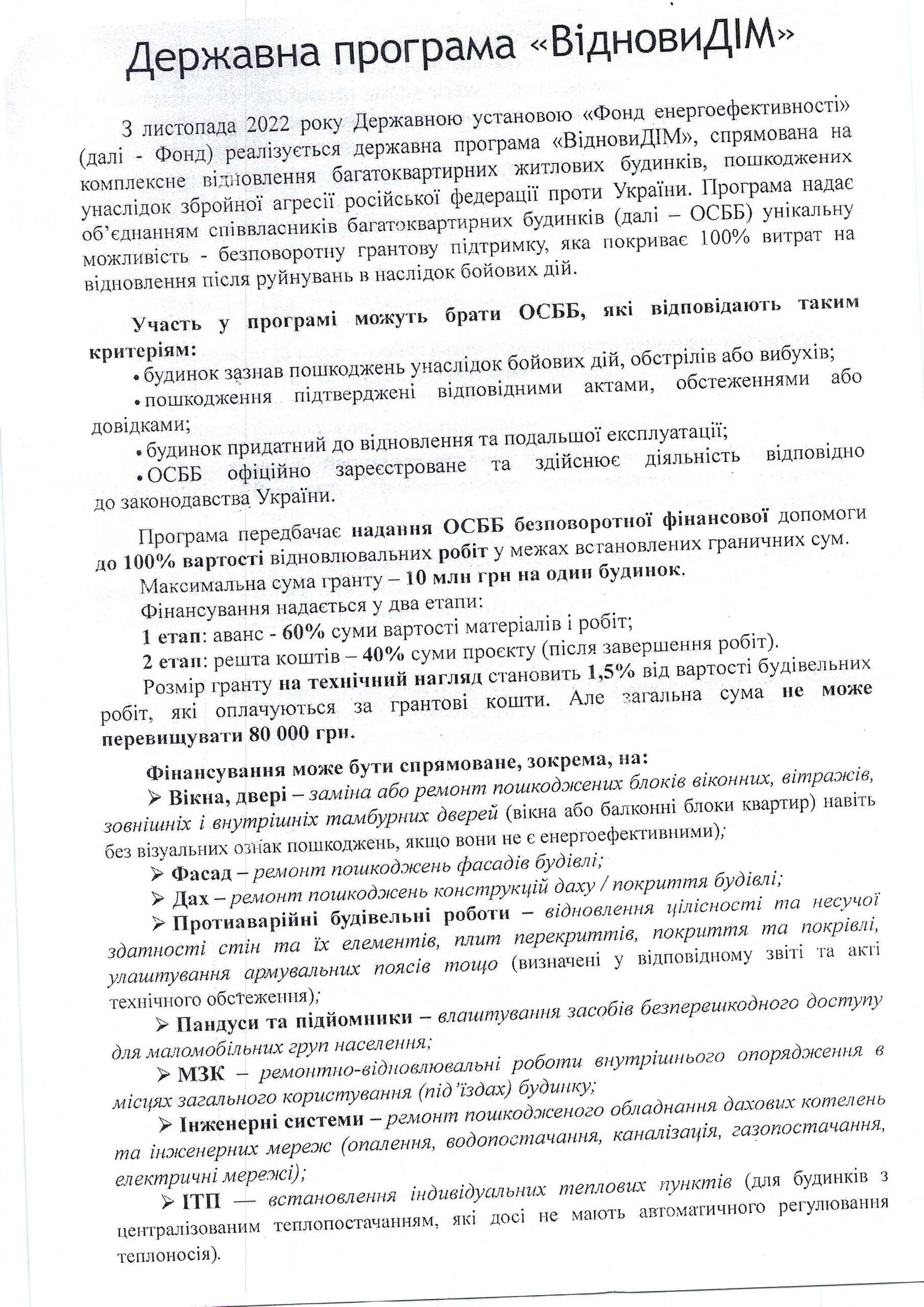 До відома керівників ОСББ, які мають можливість брати участь в державній програмі “ВідновиДІМ”.