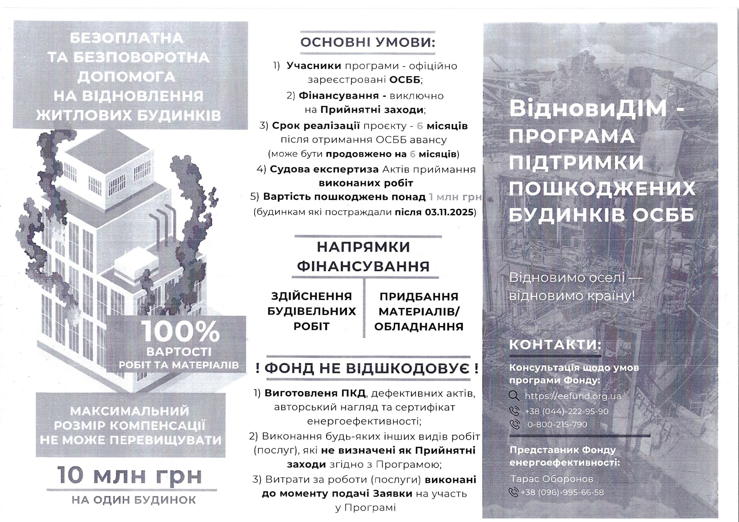Додатково до відома керівників ОСББ, які мають можливість приймати участь в державній програмі “ВідновиДІМ”, для будинків які зазнали пошкоджень в наслідок бойових дій